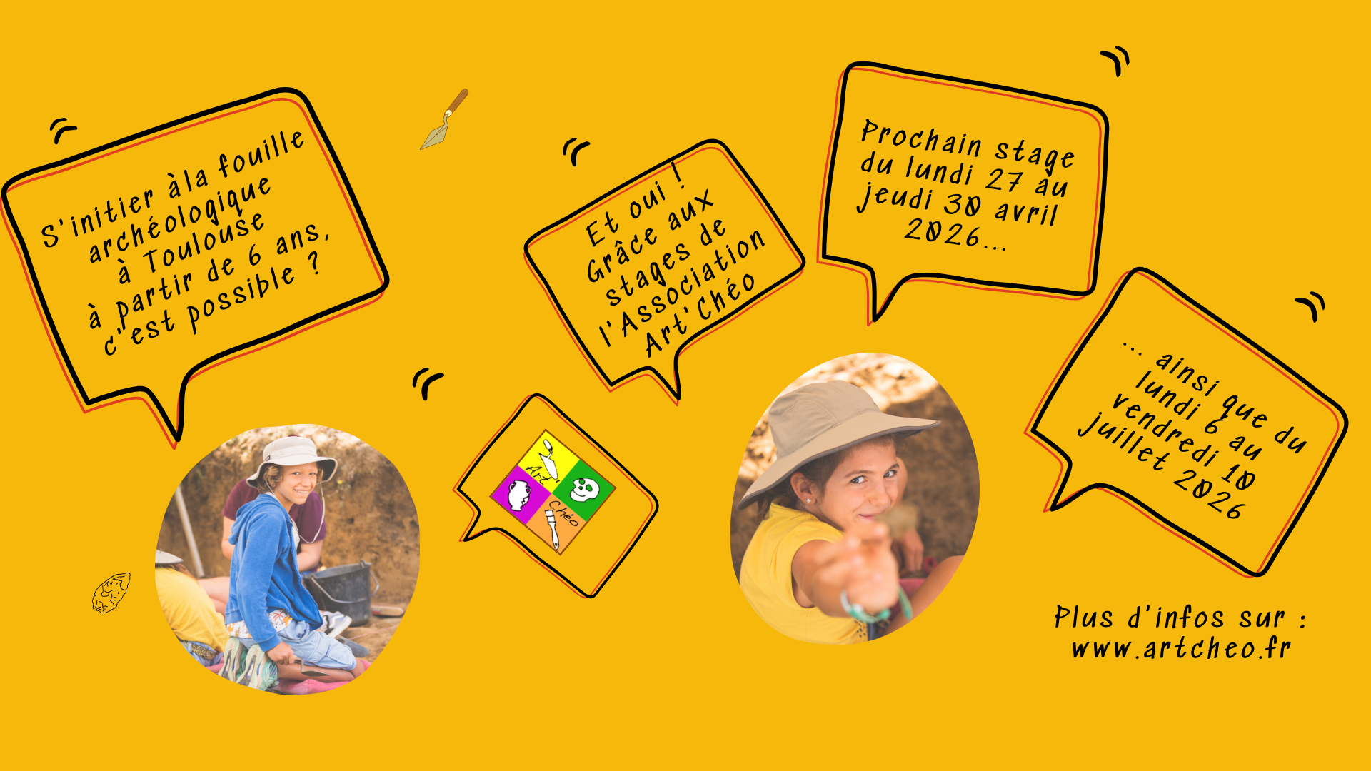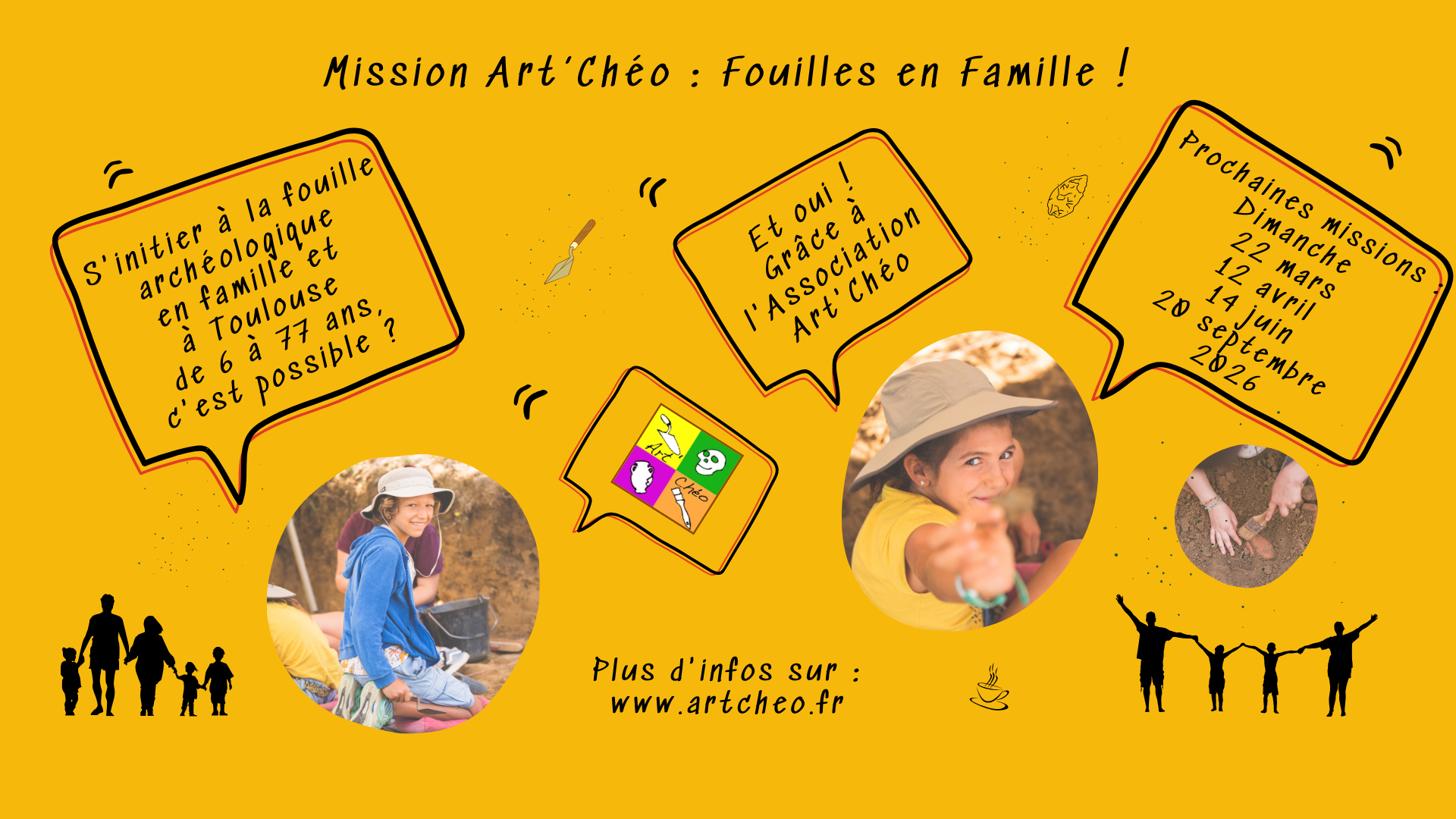 Tu viens avec tes frères et soeurs, tes cousin(e)s, tes parents, tes tantes et oncles, tes grands-parents… Et puis, nous vous accueillons au 75 rue de Fondeville 31400 TOULOUSE (devant la salle d’activités de l’Association Art’Chéo) autour d’une boisson et d’une gourmandise réconfortante. Le matériel fourni par l’Association est ensuite distribué et c’est parti pour une journée de fouille sur notre chantier-école (fouille, tamisage, relevé, photo, enquêtes…). Aucun niveau n’est exigé pour cette agréable découverte en famille ouverte de 6 à 77 ans… Façon banquet d’Astérix, la journée se termine par un convivial goûter partagé. Bonne humeur et découvertes garanties !